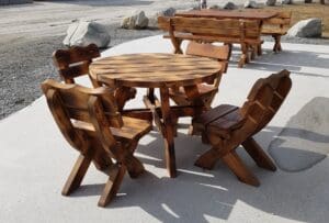 Robuste utemøbler i impregnert furu med brent look. Settet…